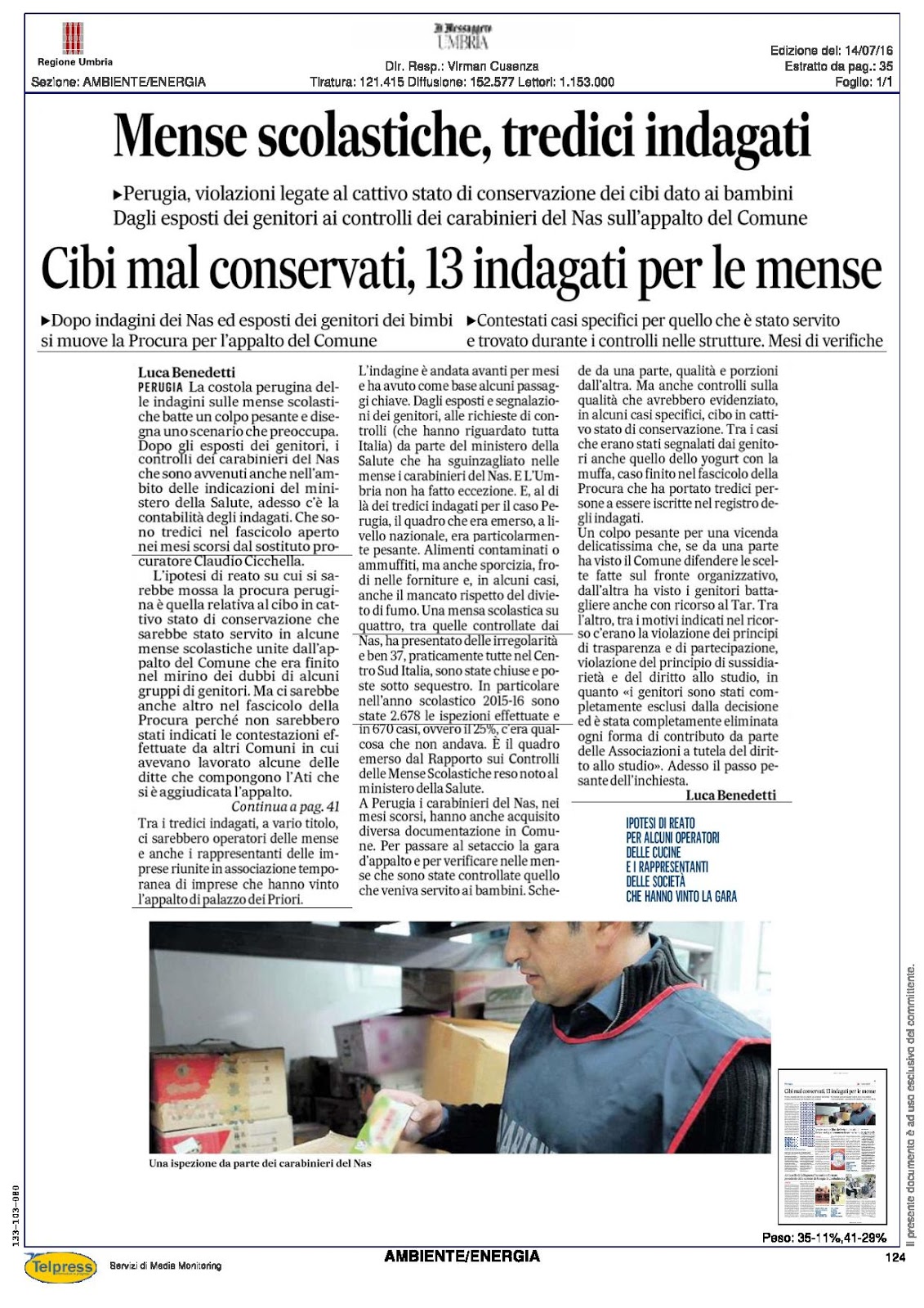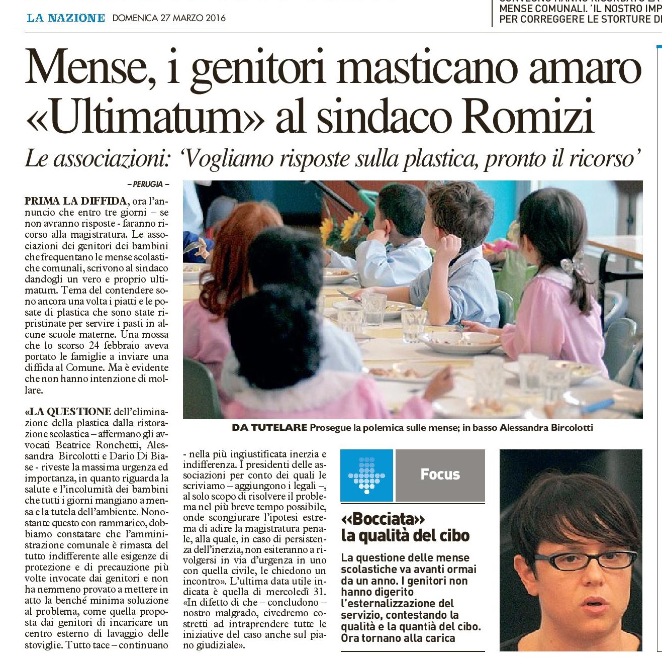 14 Luglio 2016 - Che tristezza dover dire: avevamo ragione! Avranno pensato questo i genitori che si erano impegnati per controllare la qualità del cibo, che i loro figli mangiavano alla mensa scolastica, dopo che il sostituto procuratore ha aperto un fascicolo contro 13 soggetti. Da quando i genitori sono stati esclusi dal controllo in seguito alla scelta di assegnare un maxi appalto omnicomprensivo per rendere più appetibile il bando. E così in un solo colpo l'amministrazione ha accontentato più imprese (che hanno formato l'ATI che si è aggiudicata l'appalto) e si è liberata dei problemi. Così credeva. Ma non si possono fare queste speculazioni sulla pelle delle giovani generazioni.