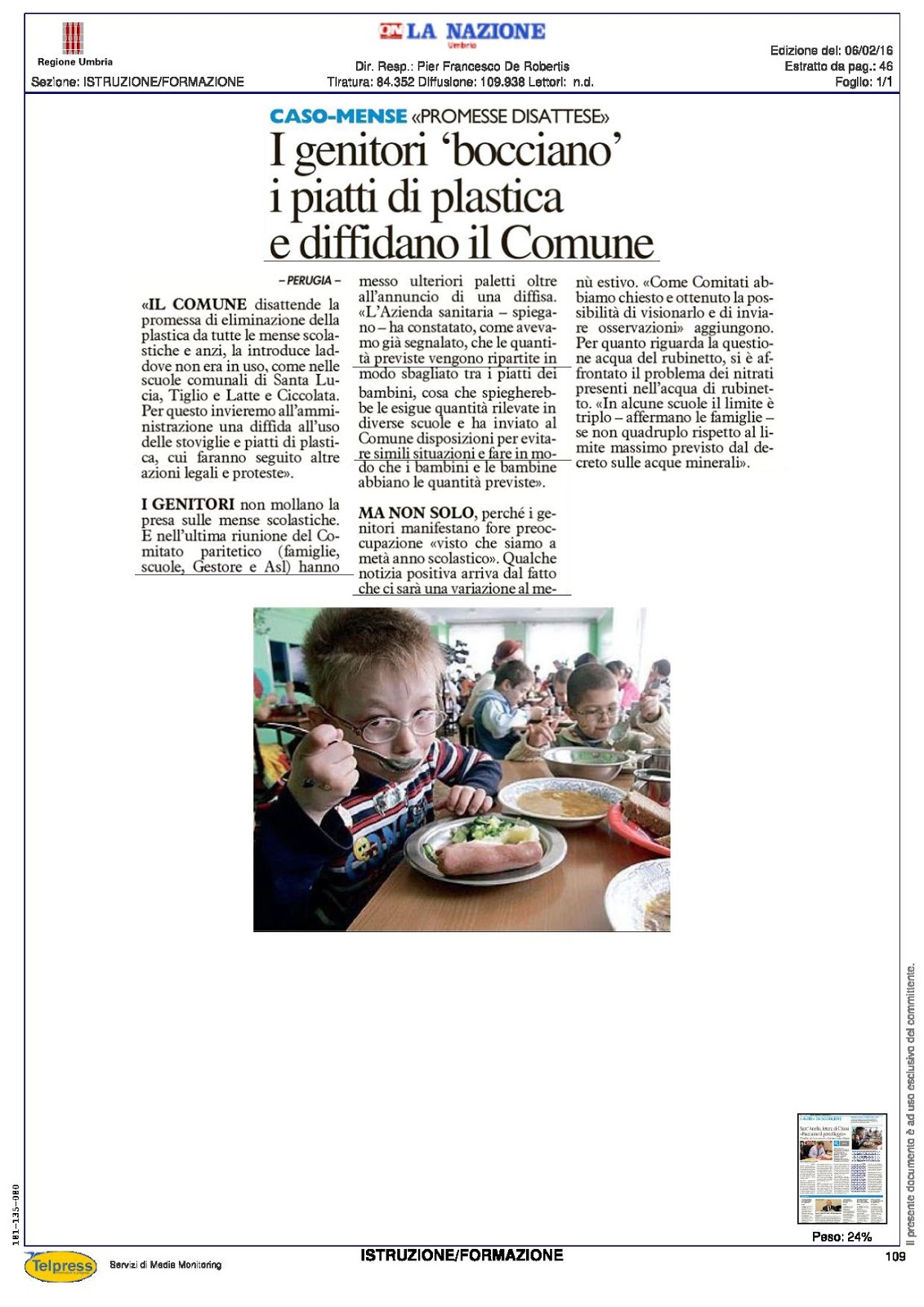 6 Febbraio 2016 - A seguire il dibattito di questi mesi sulle mense scolastiche si diventa tristi al pensiero che le vittorie dei cittadini sono sempre vittorie di Pirro. Se non si sta a presidiarle diventano in un attimo come un boomerang che torna indietro con gli interessi, passivi ovviamente. Perchè al ritorno dei piatti di plastica nelle scuole dove erano stati, giustamente e virtuosamente, sostituiti da quelli in ceramica si aggiunge anche l'altra grande criticità della quantità insufficiente. Inoltre, l'acqua del rubinetto, il cui consumo è cosa buona e giusta al posto di quella imbottigliata, deve rispettare i parametri sanitari e sappiamo che ci sono zone in cui le acque sono troppo ricche di nitrati. Il comune di Perugia dispone della mappatura delle aree in cui le acque hanno il valore dei nitrati oltre i limiti, quindi i rimedi per quelle zone si possono mettere in campo.